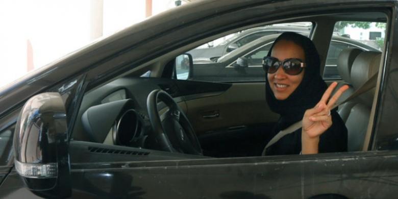 Aktivis wanita Arab Saudi Manal al-Sharif, yang kini tinggal di Emirat Arab Bersatu, menunjukkan lambang kemenangan dengan jarinya saat dia memandu keretanya di Dubai. | AFP